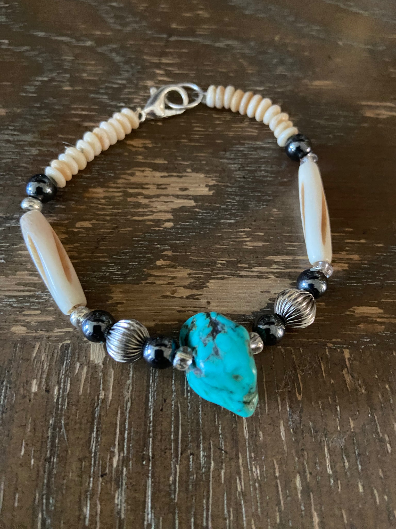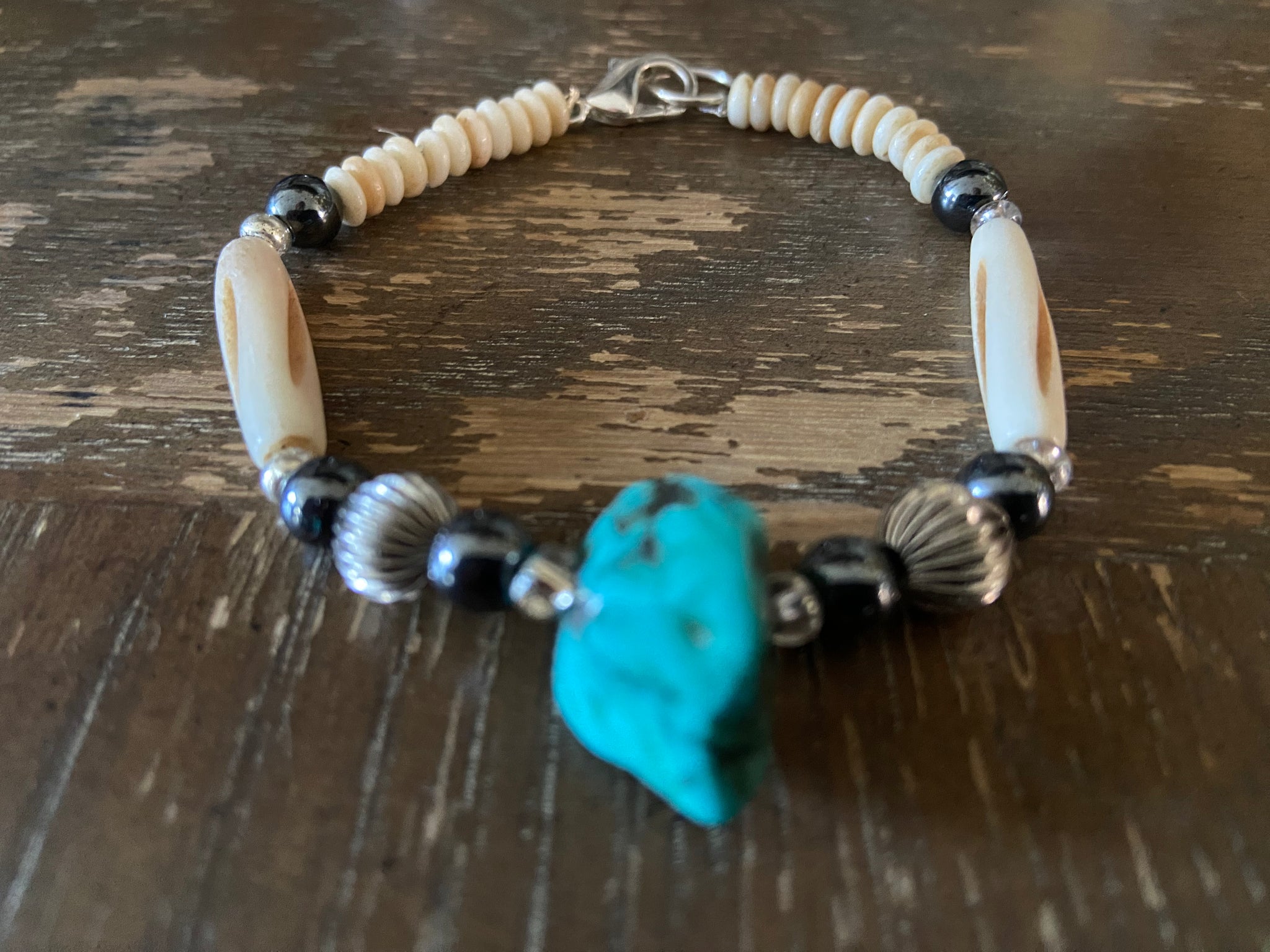 This bracelet is made of Buffalo bones and genuine natural Turquoise. Buffalo symbolizes strength an abundance fro Indigenous tribes of America.