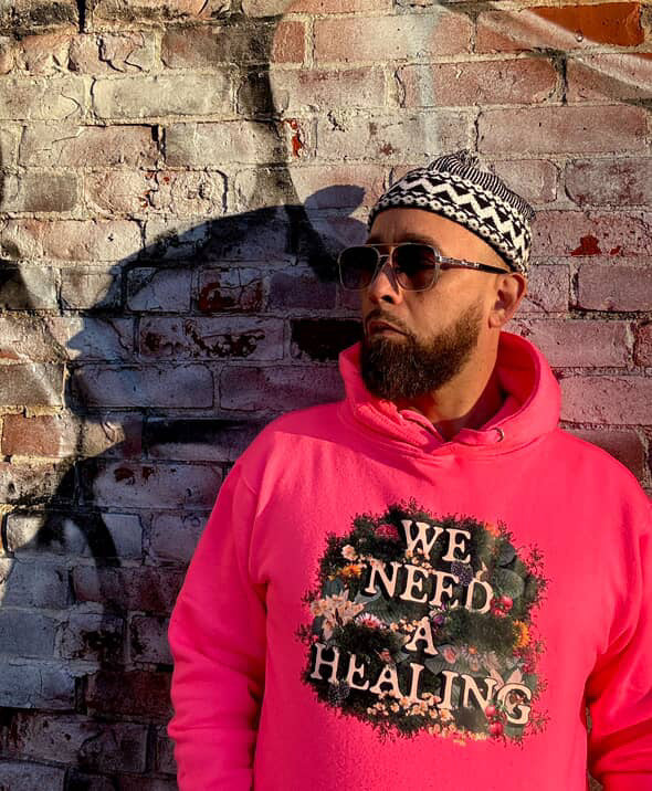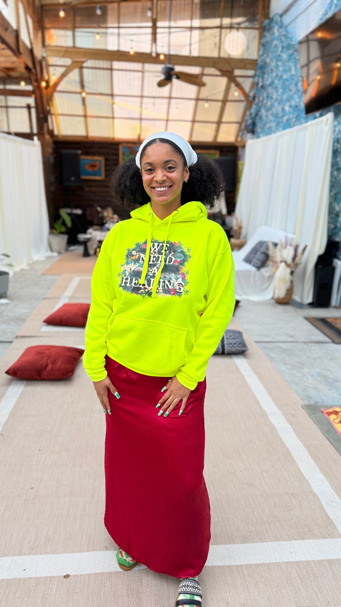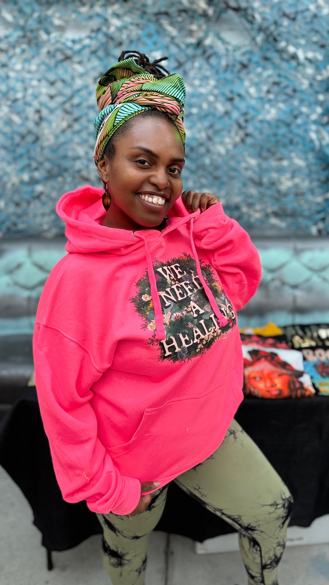 This fan favorite is a soft cotton blend hoodie with a large pocket in the front. Its currently comes in Black, Neon Yellow and Neo Pink. The Slogan "We need a healing" in front of the floral backdrop is an ode to the lead single of Mumu Fresh's latest album "The Healing".