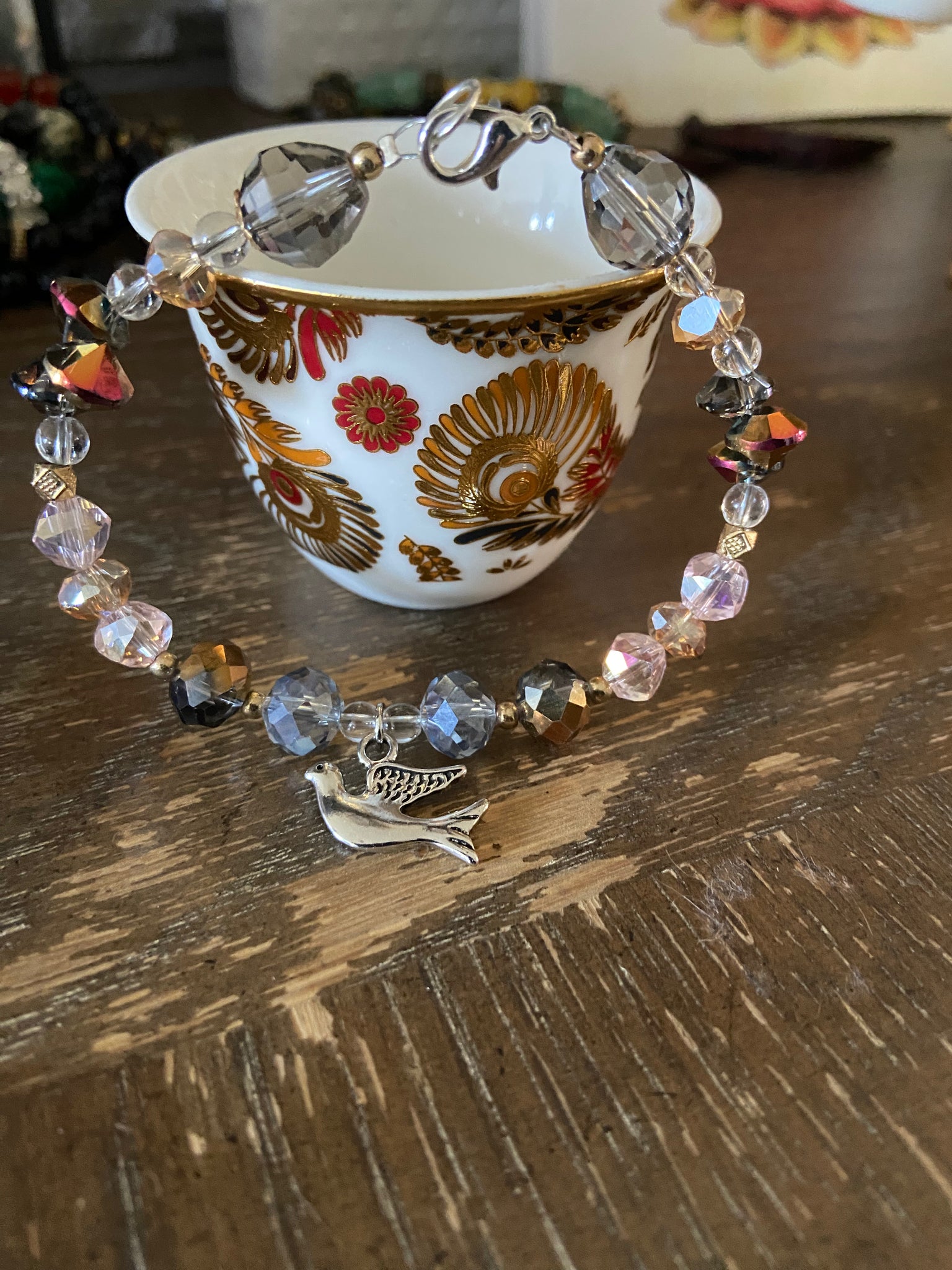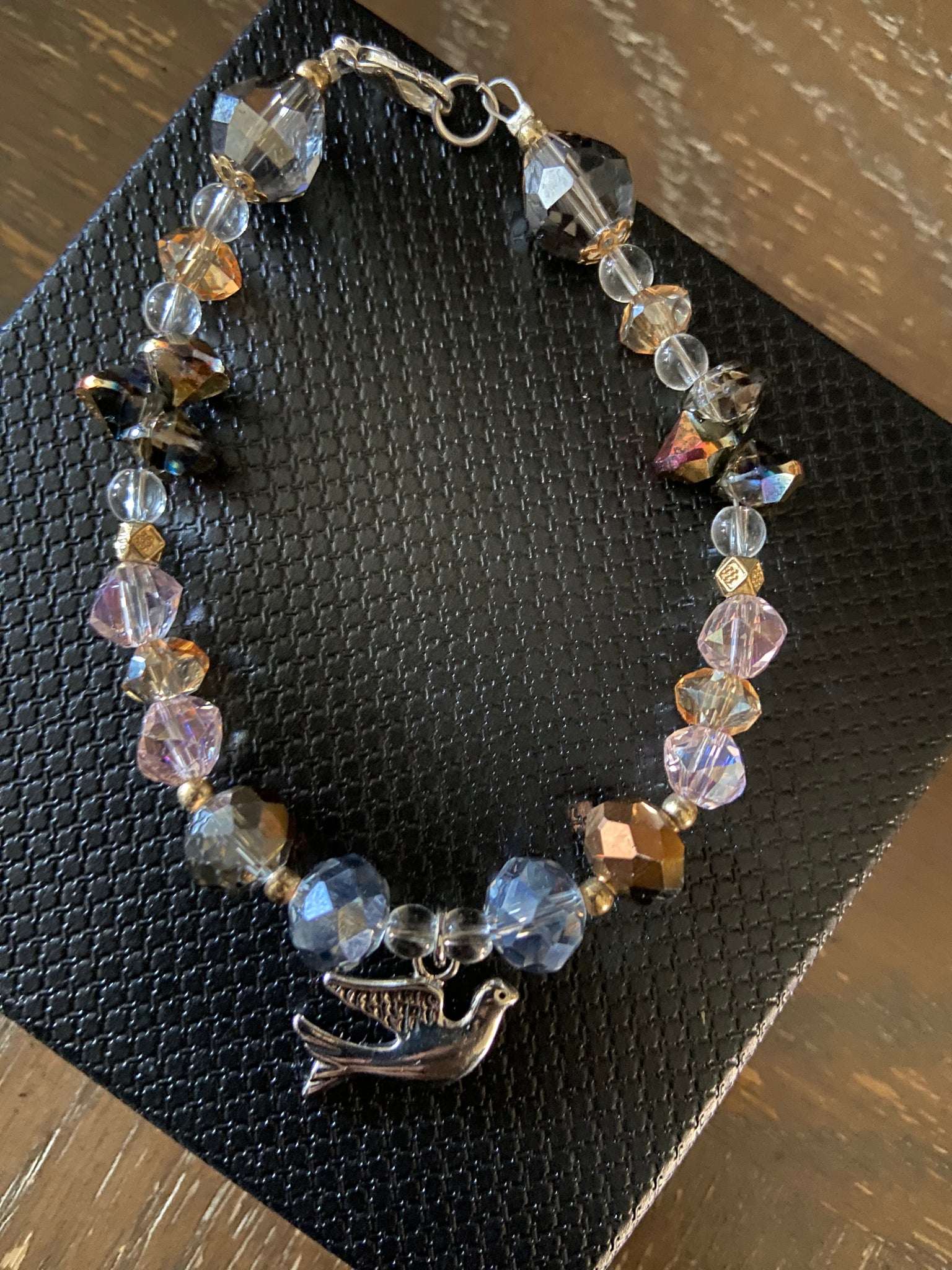 This bracelet is made of crystal and glass beads with a metal dove charm strung on tiger's wire for durability.